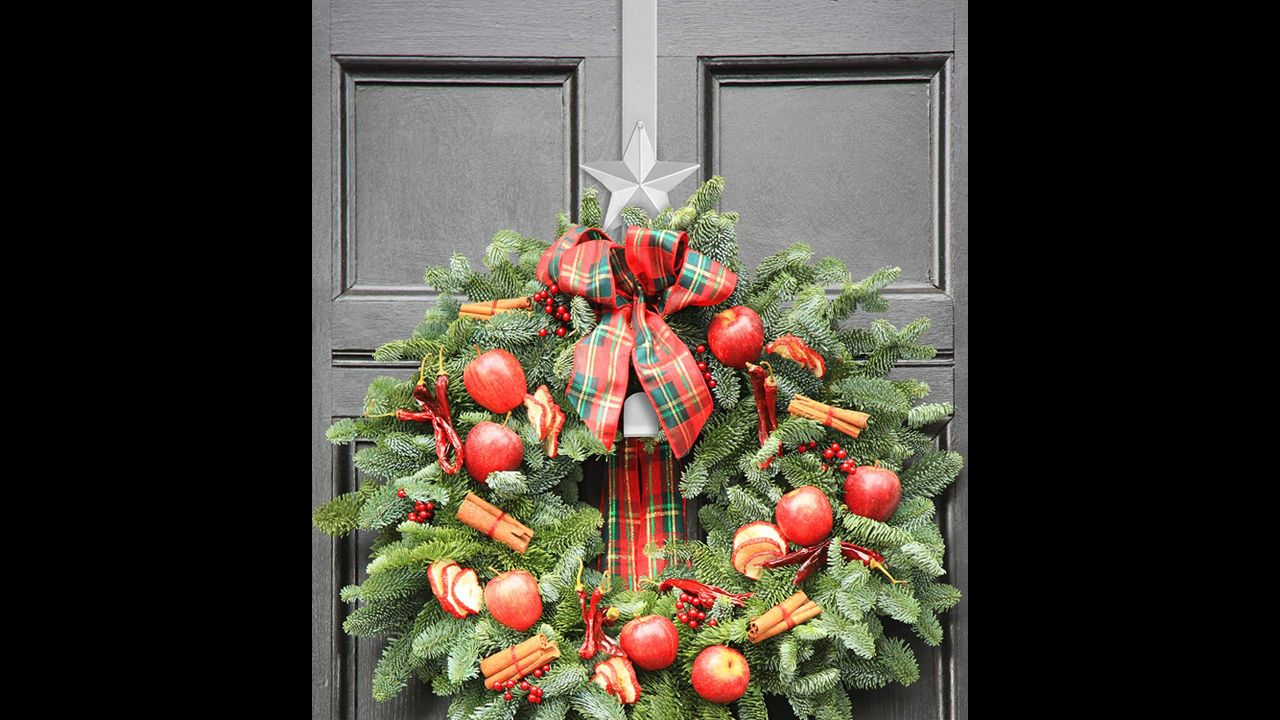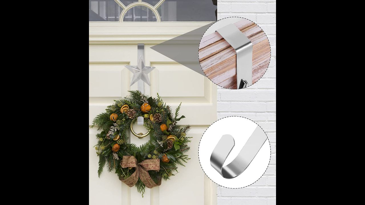 Praktyczny wieszak na świąteczną dekorację drzwi. Wykonany z wytrzymałego materiału z ozdobną gwiazdą. Można na nim zawiesić dowolne dekoracje na dowolne święta.