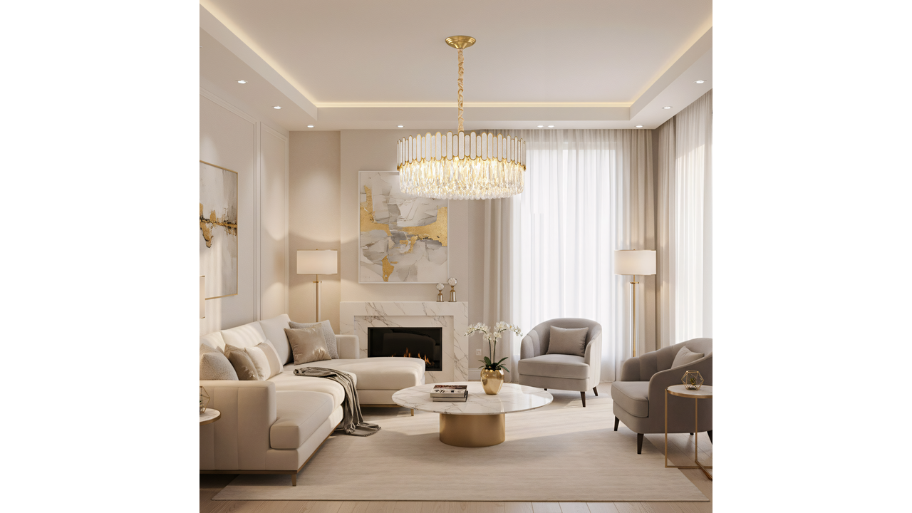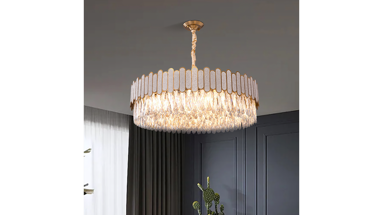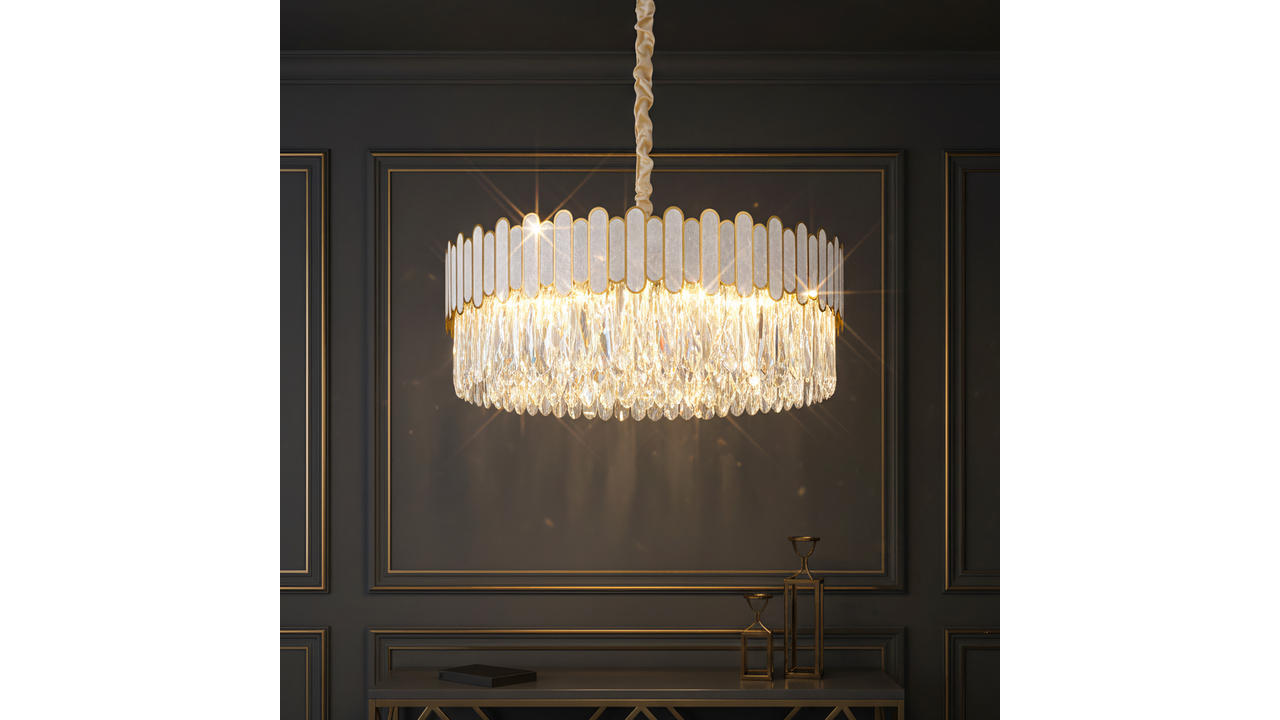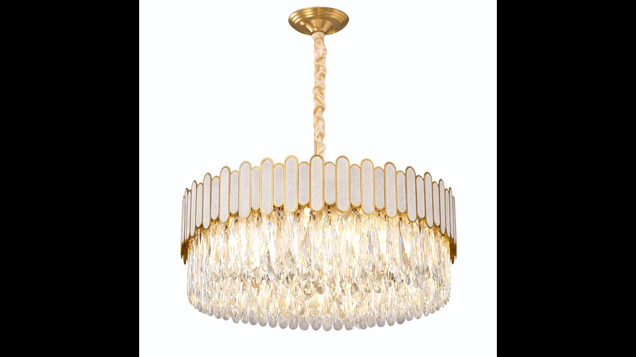 Елегантна підвісна лампа з кришталевими елементами створена для інтер’єрів, у яких важливі декоративний ефект, світло та продумані деталі. Конструкція виконана з металу в золотому оздобленні, що надає виробу розкішного характеру та чудово поєднується з підвісними скляними кристаликами. Їхня точна форма та прозора структура забезпечують ефектне розсіювання світла, створюючи в приміщенні приємну, елегантну атмосферу.