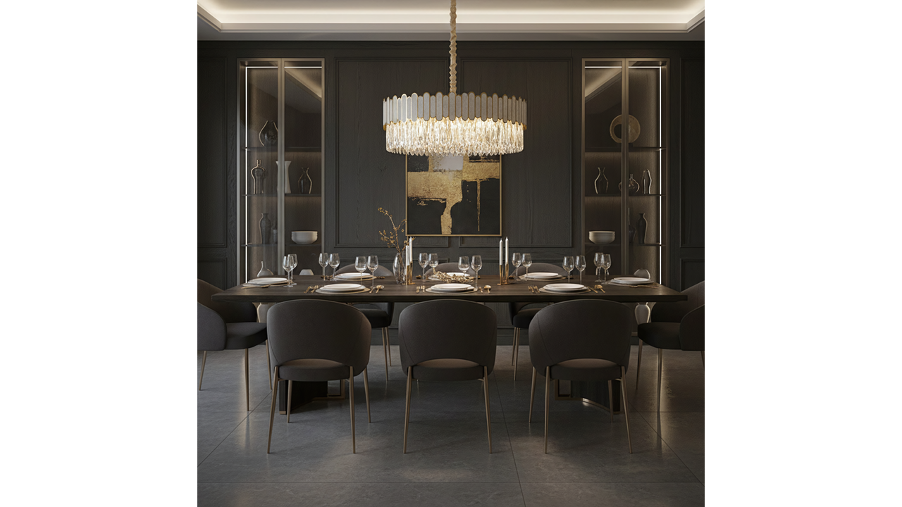 Світильник розрахований на 8 лампочок E14, що дозволяє отримати інтенсивне, але водночас декоративне освітлення—ідеальне для вітальні, їдальні, представницької спальні або простору над столом. Золотий метал у поєднанні з кристаликами підкреслює стилі glamour, modern classic та елегантні сучасні інтер’єри, де лампа відіграє роль виразного центрального елемента.