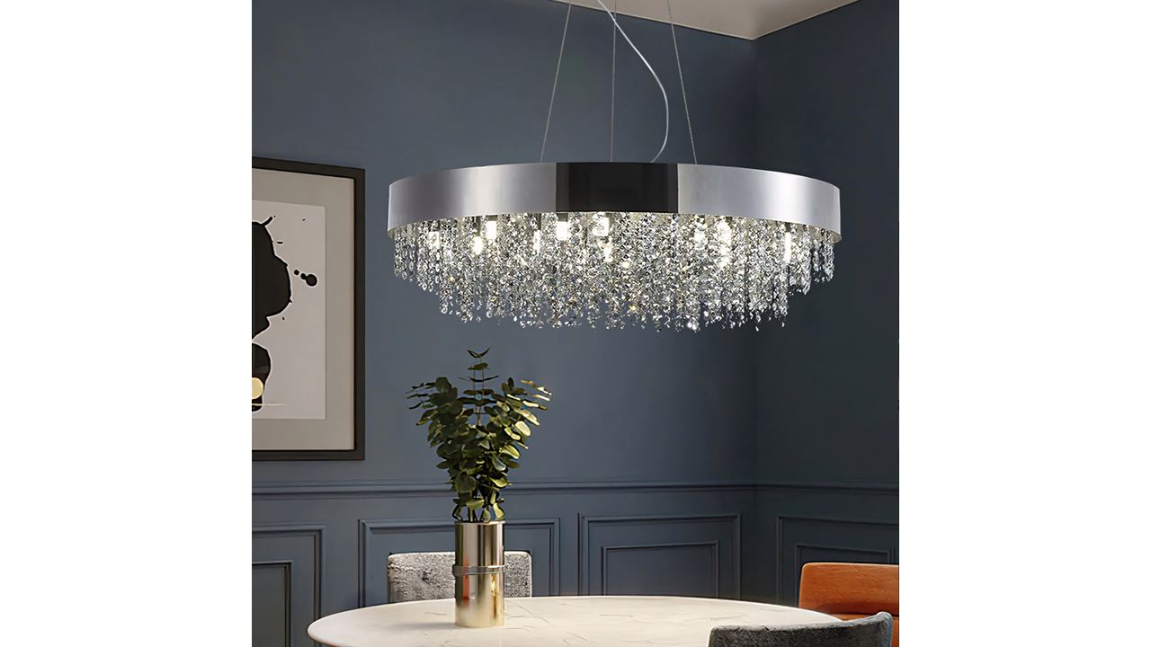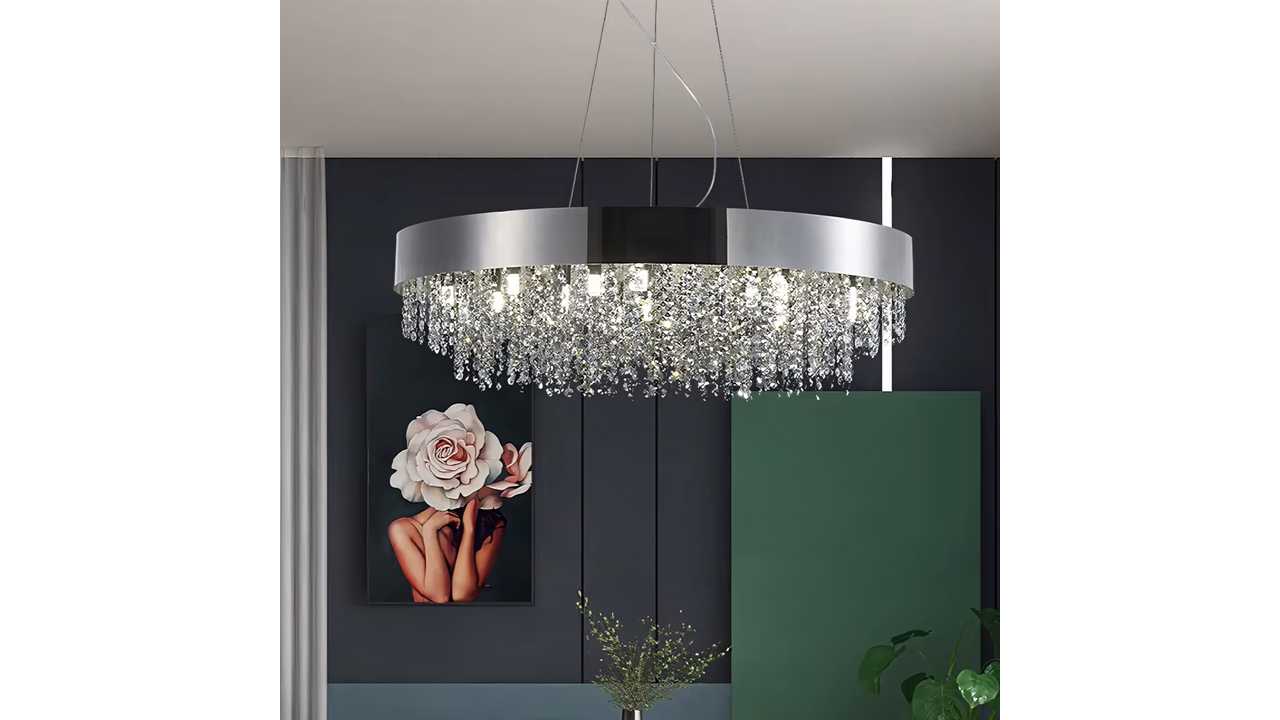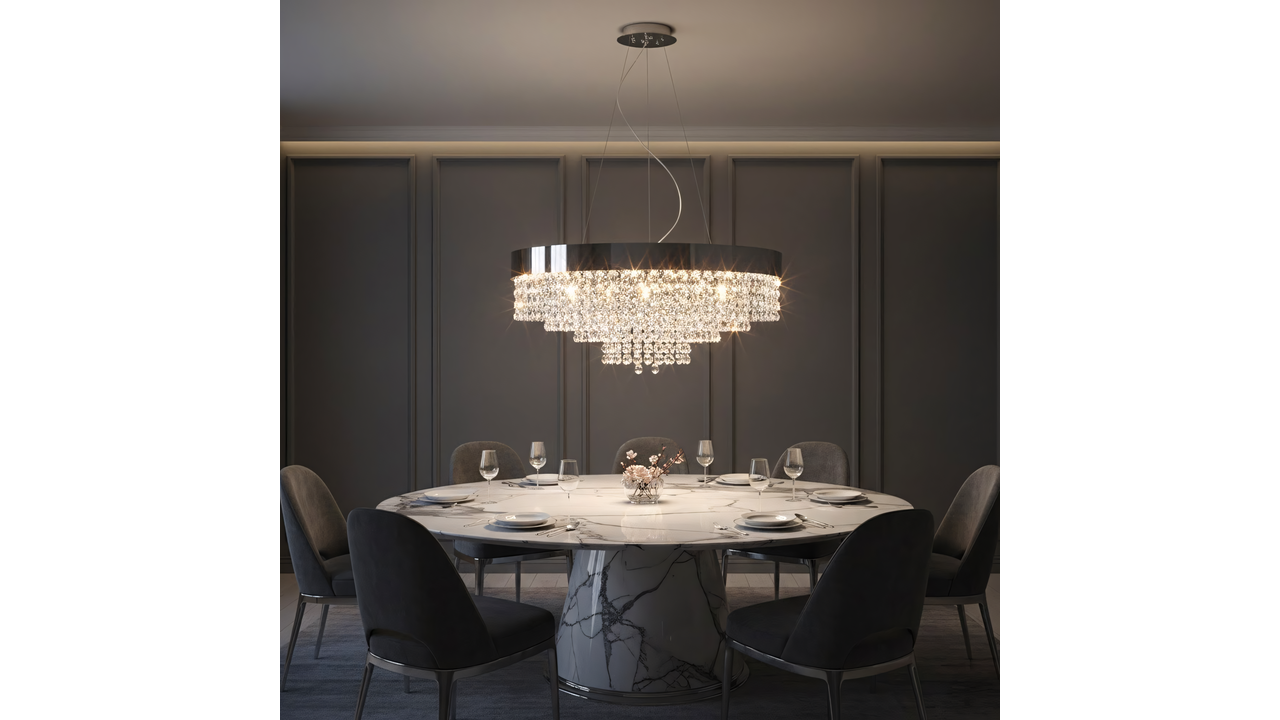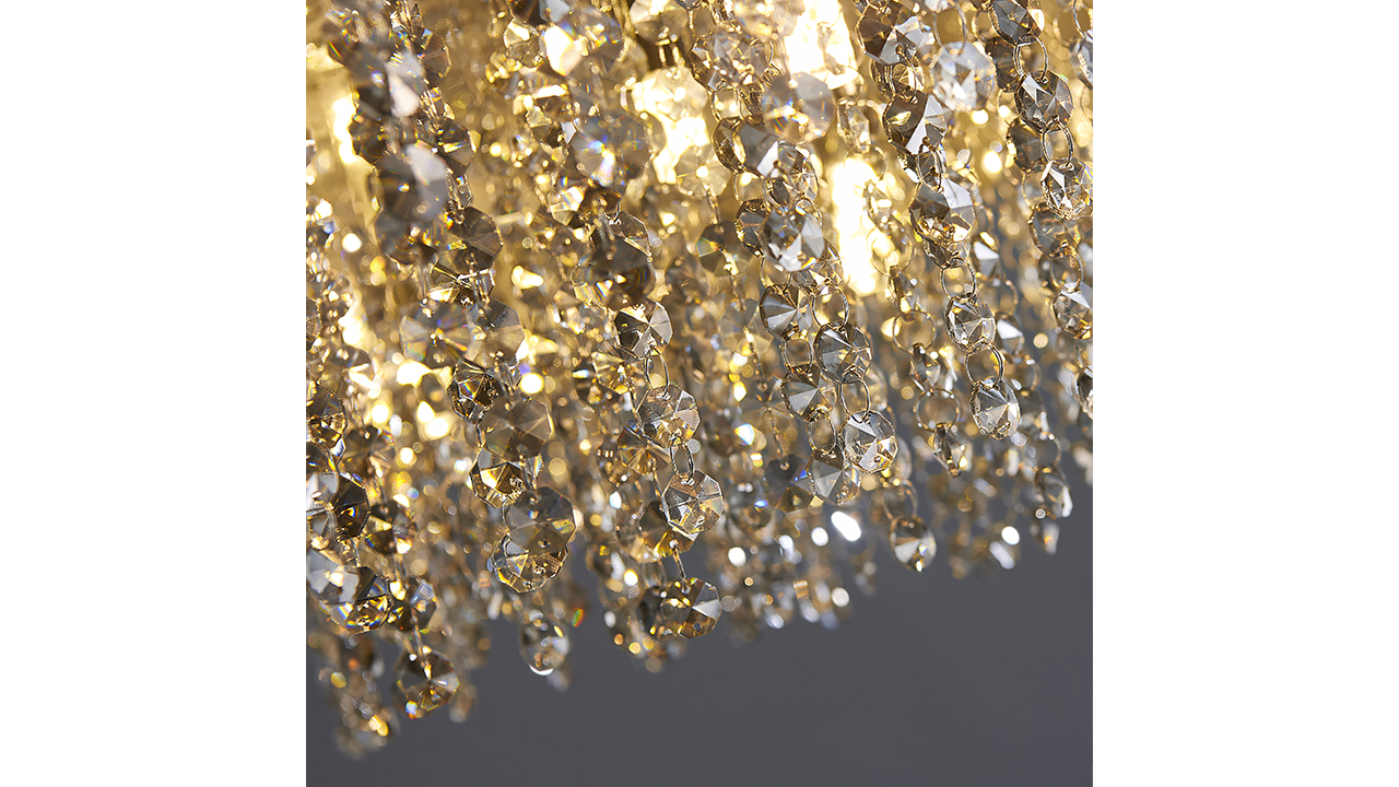 Нижня частина утворена щільною композицією прозорих декоративних елементів із кристальним ефектом, які красиво заломлюють і розсіюють світло. Завдяки багатошаровій структурі світильник створює вражаючу ілюмінацію, підкреслюючи елегантність вітальні, їдальні, зони над столом або представницького холу. Ніжні відблиски додають інтер’єру відчуття розкоші та глибини.