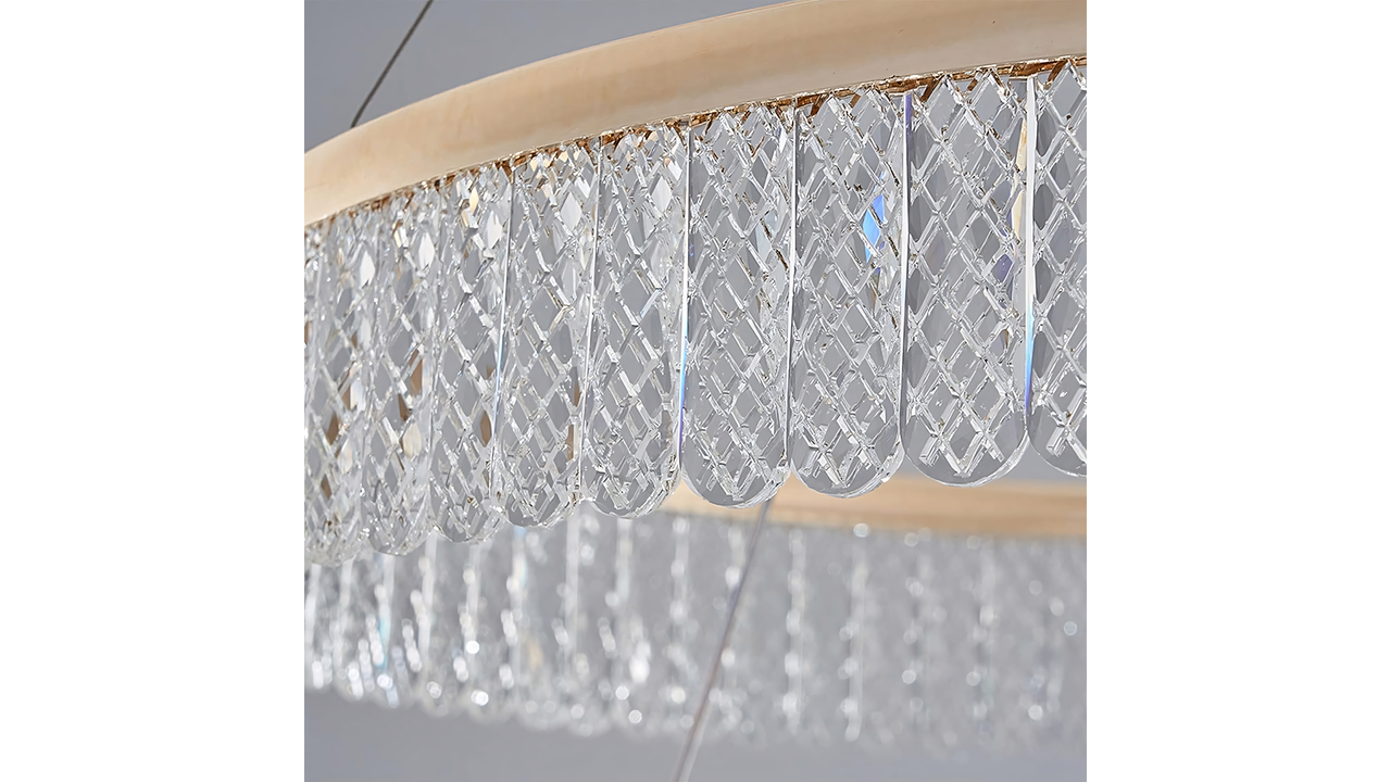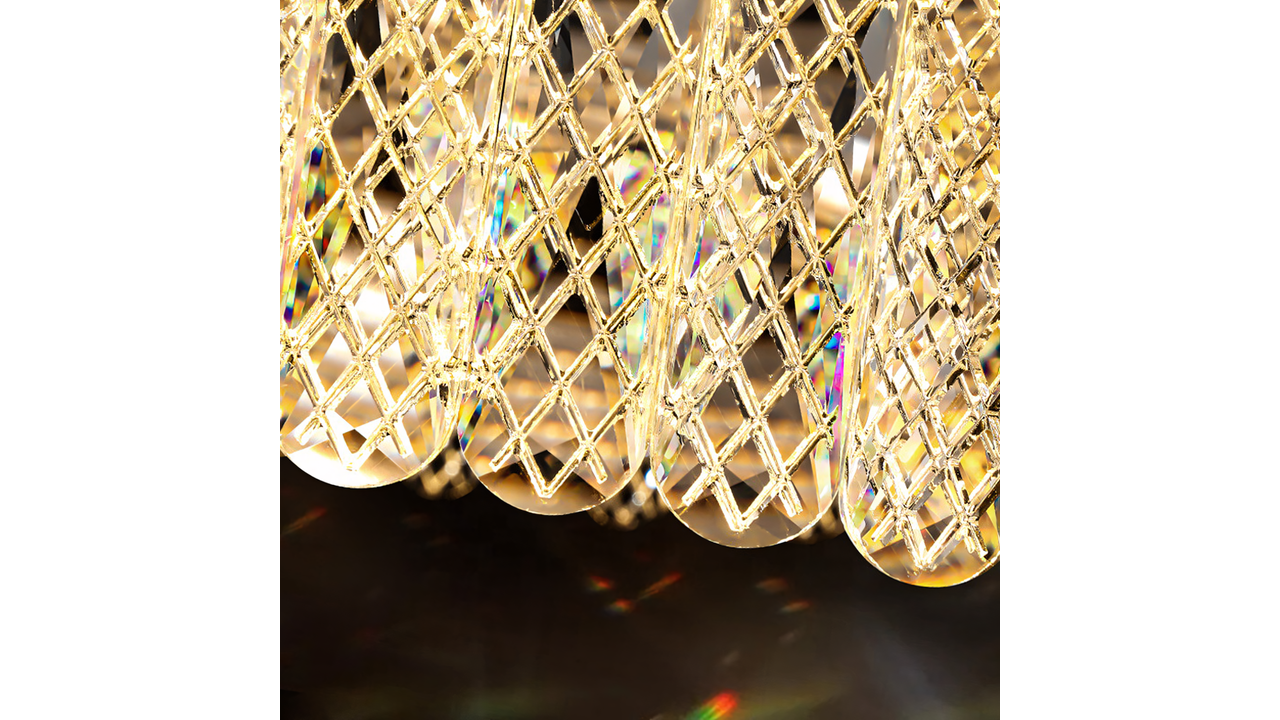 Найбільш декоративним елементом є скляні «кристалики», що утворюють багаторівневу, об’ємну композицію. Їхні точні грані красиво заломлюють і розсіюють світло, завдяки чому світильник не лише ефективно освітлює простір, а й виконує роль виразної прикраси інтер’єру.