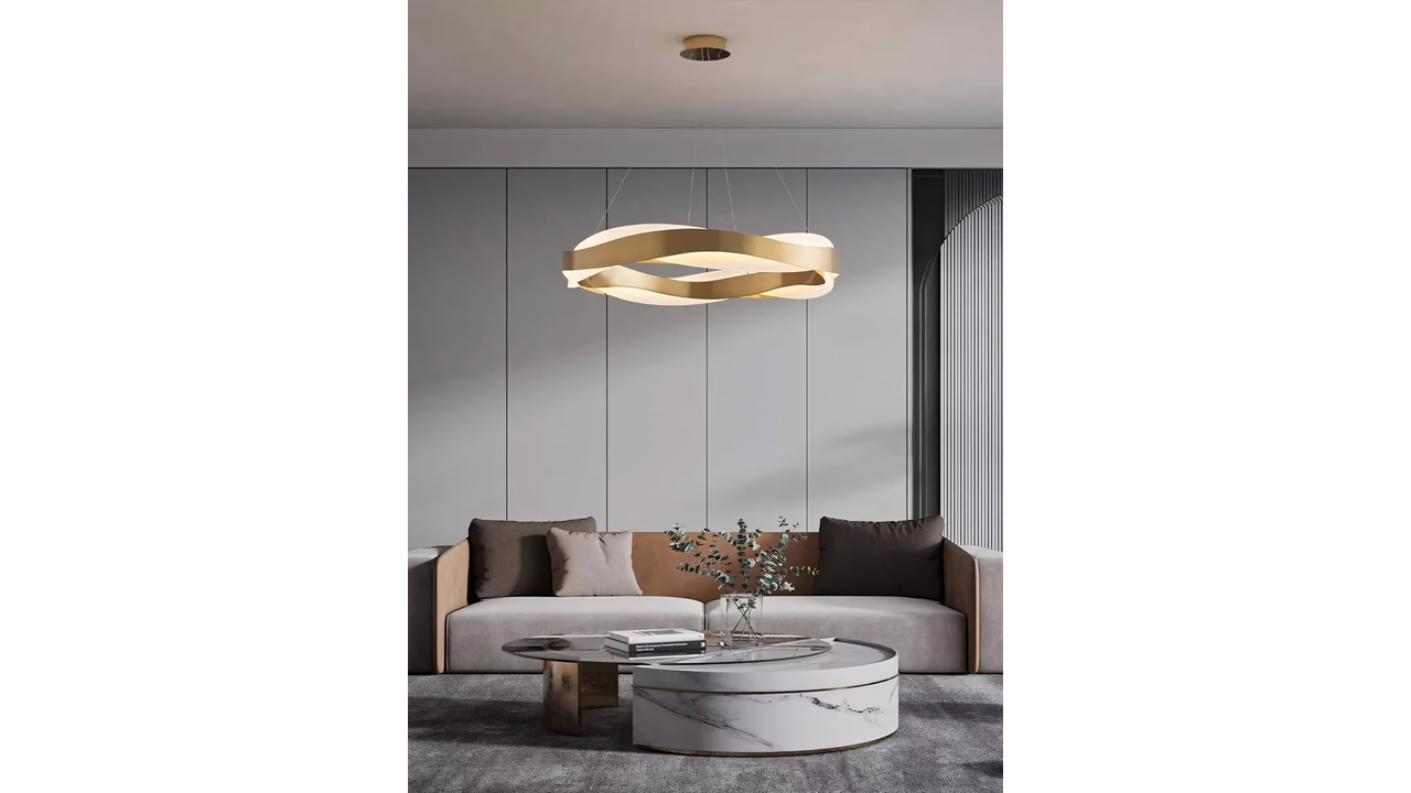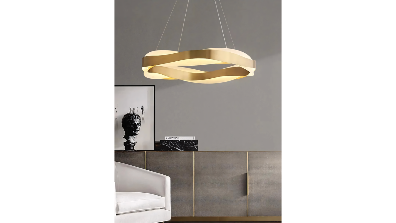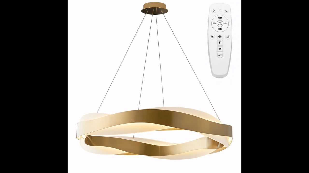 La lampe suspendue LED de plafond moderne avec télécommande est une combinaison spectaculaire d’une forme élégante, d’une technologie avancée et d’une finition luxueuse. La structure est réalisée en métal avec une finition or brossé, qui lui confère un caractère noble et s’intègre parfaitement aux intérieurs modernes, modern glamour et contemporary. Sa forme dynamique, ondulée, attire le regard : la lampe ne remplit pas seulement une fonction d’éclairage, elle devient aussi un élément décoratif, véritable point central de la pièce.