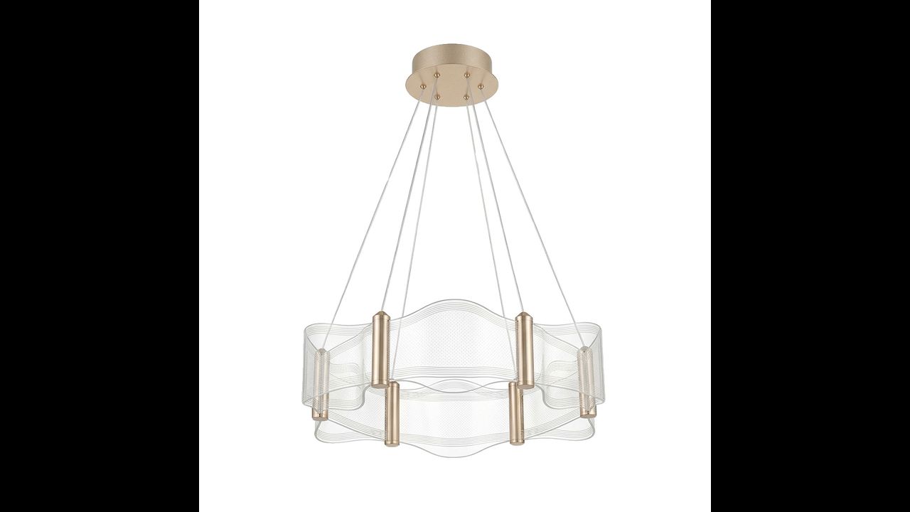 Підвісна лампа — це сучасний і надзвичайно ефектний освітлювальний прилад, який захоплює легкою художньою формою та елегантною обробкою. Золота конструкція поєднана з декоративною хвилястою панеллю з прозорого пластику, завдяки чому вся композиція виглядає витончено і водночас дуже дизайнерськи. Це модель, яка ідеально впишеться в сучасні вітальні, їдальні, спальні та стильні комерційні приміщення.