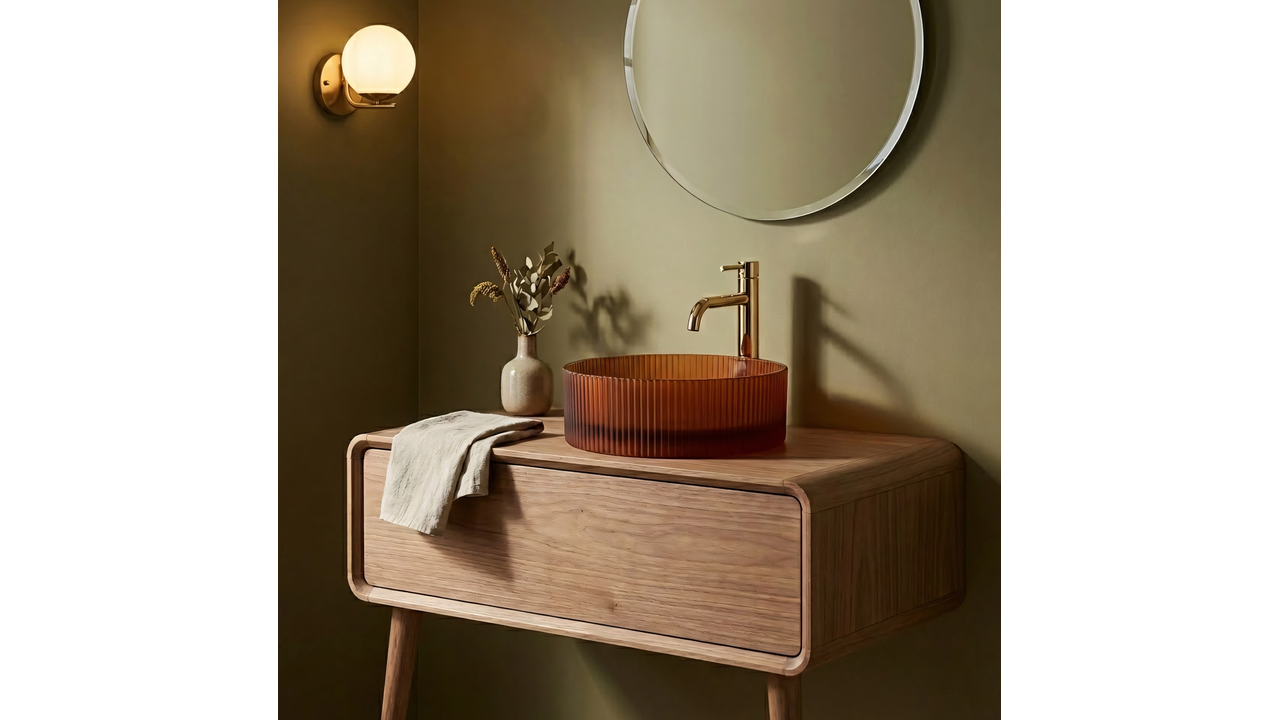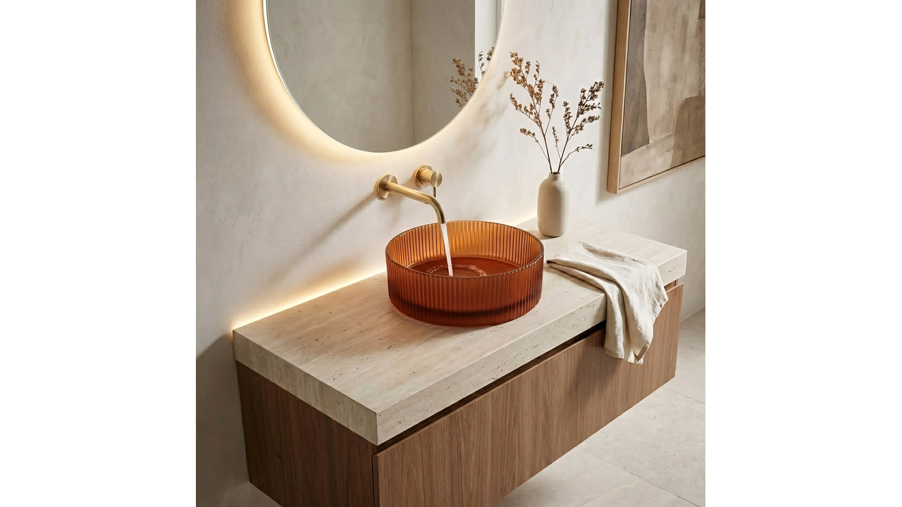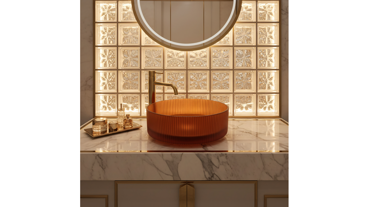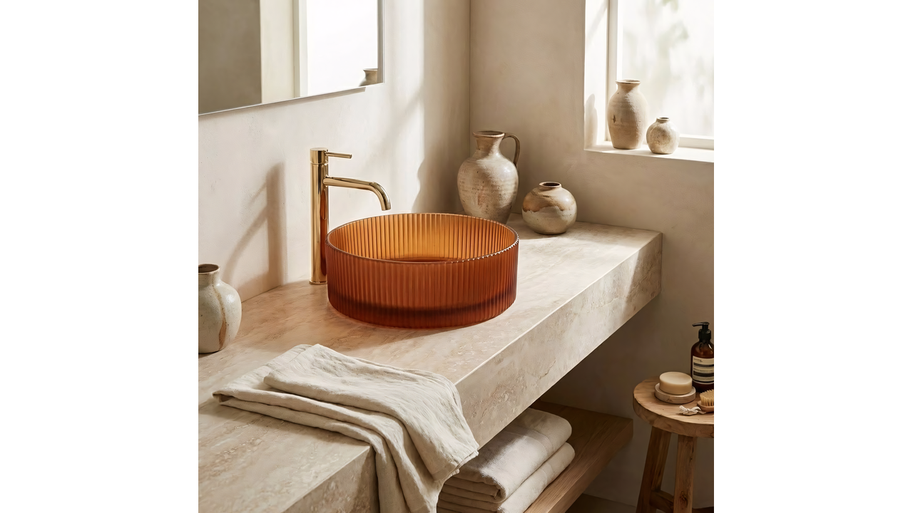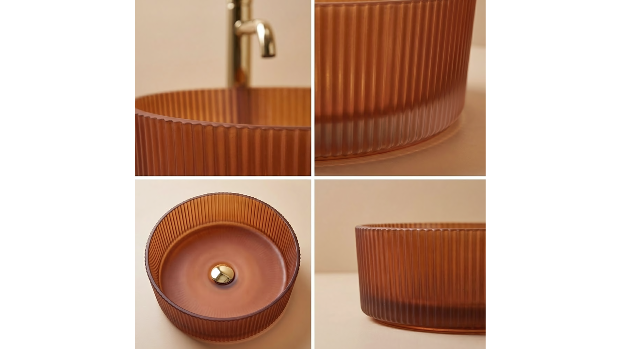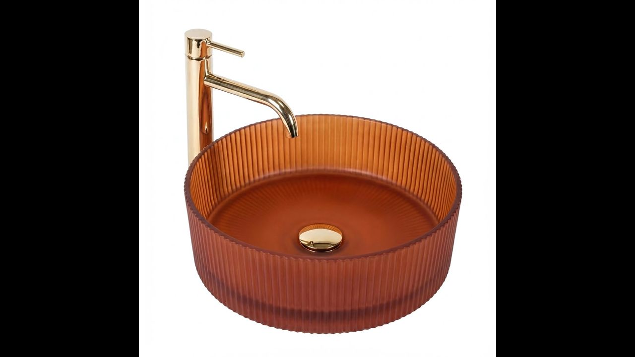 Скляний умивальник Rea Suri поєднує міцність матеріалу з декоративною формою. Матовe рифлене скло у бурштиновому відтінку — це надійний та естетичний вибір, який чудово доповнить зону умивальника і надасть їй цілісного характеру — незалежно від того, оформлюєте ви ванну в ретро чи сучасному стилі.